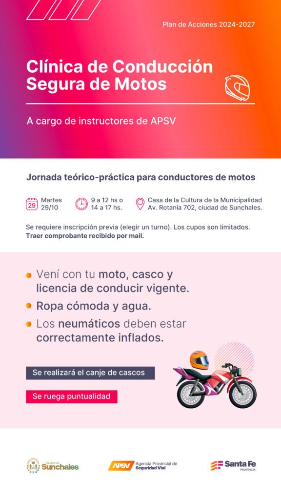 ✅ El martes 29 de octubre de 9:00 a 12:00 hs o de 14:00 a 17:00 hs se llevará a cabo en la Casa de la Cultura (Rotania 702) una "Clínica de Conducción Segura de Motos" a cargo de instructores de la Agencia Provincial de Seguridad Vial (APSV) @apsv_santa_fe