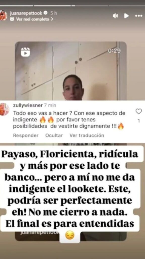 “¿Todo eso vas a hacer? Con ese aspecto de indigente. Por favor, tenés posibilidades de vestirte dignamente”, fue uno de los que eligió para contestarle a esa usuaria pero también a las demás que la criticaron. “Payaso, Floricienta, ridícula y más por ese lado, te banco… Pero a mí no me da indigente, el lookete. Este, podría ser perfectamente, eh. No me cierro a nada. El final es para entendidas”, dijo Juana tratando de desdramatizar.