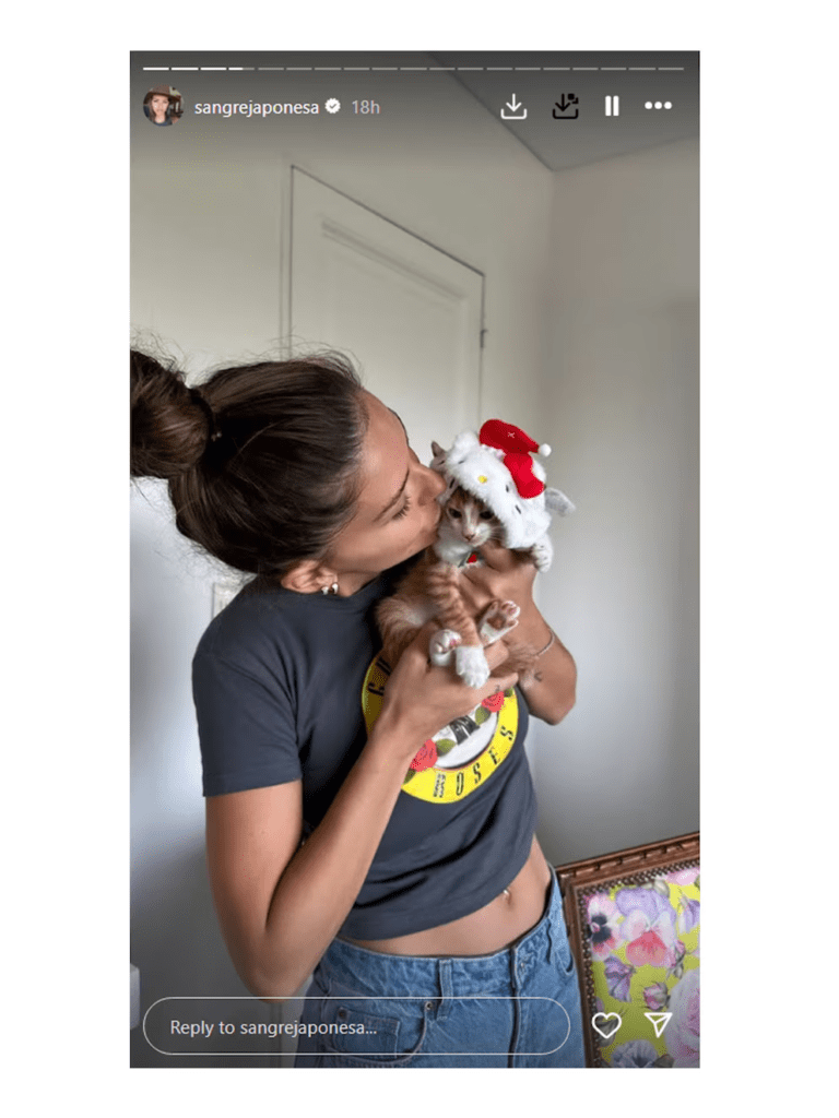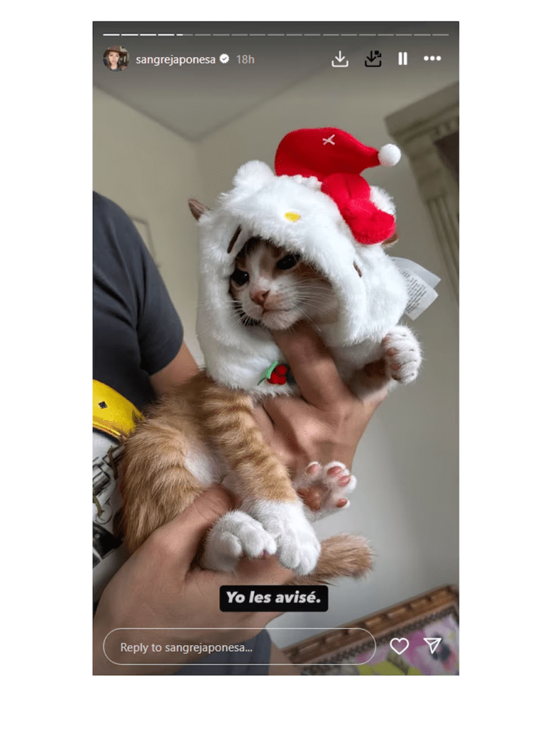 En las postales, Coco aparecía luciendo con un simpático gorro de Papá Noel inspirado en Hello Kitty, uno de los personajes animados favoritos de la exintegrante de Casi Ángeles. Aunque su expresión no deja dudas sobre lo poco entusiasmado que estaba con la situación. “Yo les avisé”, escribió su flamante con humor sobre una de las fotos, mientras sostiene al pequeño gatito que, con mirada seria, posa para la cámara.
