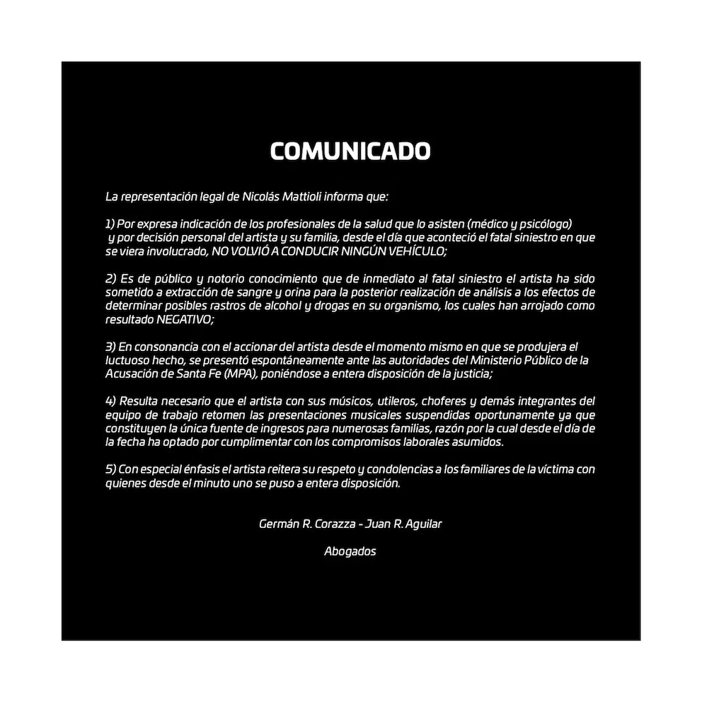 El comunicado también detalla que, inmediatamente después del accidente, Mattioli fue sometido a pruebas de sangre y orina para verificar la presencia de alcohol o drogas en su organismo. Estos análisis, según indica el texto, dieron resultado negativo, lo que descarta cualquier influencia de sustancias en el momento del siniestro. Además, el artista subrayó que en todo momento colaboró con la justicia, presentándose de manera voluntaria ante las autoridades del Ministerio Público de la Acusación de Santa Fe (MPA), además de ponerse a disposición para el avance de la investigación.