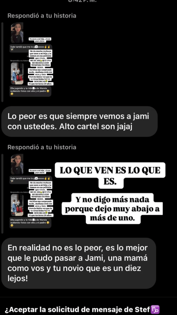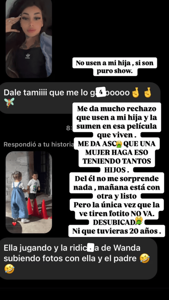 A través de su cuenta de Instagram, Tamara mostró capturas de pantalla con la indignación de sus seguidores, quienes por mensaje privado le dieron su apoyo. “Ella jugando y la ridícula de Wanda subiendo fotos con ella y el padre”, escribieron a la joven. En ese sentido, la influencer expresó: “Me da mucho rechazo que usen a mi hija y la sumen en esa película que viven. Me da asco que una mujer haga eso teniendo tantos hijos”. No se detuvo ahí y también criticó sin filtro al padre de la hija en común: “De él no me sorprende nada. Mañana está con otra y listo. Pero la única vez que la ve tiran fotito. No va. Desubicada. Ni que tuvieras 20 años”.