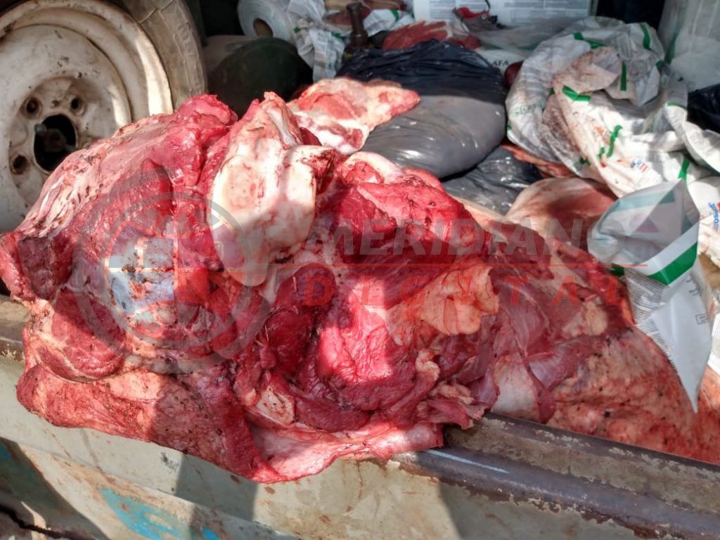 En el lugar se interceptó una camioneta modelo marca Jeep color gris y celeste con cúpula blanca, la que tiraba un acoplado de un eje dónde transportaba un animal vacuno, categoría novillito, sexo macho, pelaje negro, raza cruza, de unos 170 kg aproximadamente, sin vida, orejano de marca y señal, mientras que en el interior de la cúpula de la camioneta se observaron diferentes cortes de productos cárnicos de origen bovino, de unos 180 kg promedio aproximadamente, dé reciente faena.