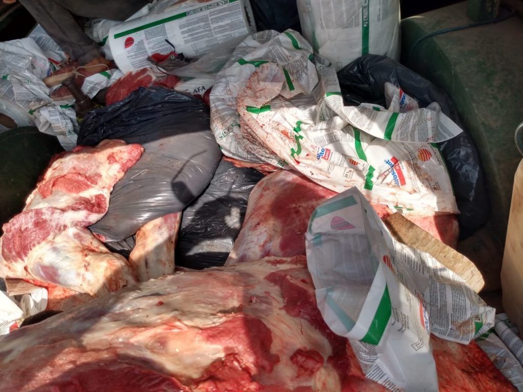 Argumentando además que dichos animales eran trasladados para luego ser consumidos. Ante la notoria infracción al artículo 206 CPA, por trasladar animal y/o producto cárnico sin ningún tipo de autorización, infligiendo toda normativas sanitarias, observando que los productos mencionados viajaban juntos a bidones de combustible y otros elementos contaminantes en el interior de la cúpula, de igual manera el animal sin vida se hallaba muy hinchado debido a la cantidad de horas de producida su muerte.