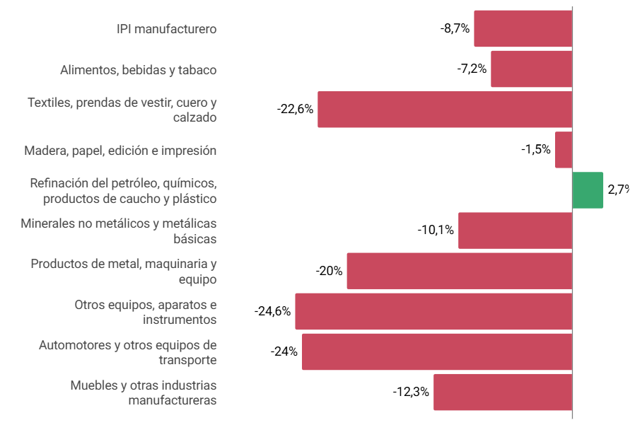 Otros sectores con caídas de dos dígitos incluyeron a los “Productos de caucho y plástico” (-15,7%), “Productos de tabaco” (-14,9%), “Industrias metálicas básicas” (-12,5%) y “Muebles y colchones, y otras industrias manufactureras” (-12,3%). Por su parte, la contracción también alcanzó a rubros como “Productos de metal” (-5,7%), “Productos minerales no metálicos” (-7,2%), “Prendas de vestir, cuero y calzado” (-18,2%) y “Madera, papel, edición e impresión”, que presentó una baja del 1,5% respecto al mismo mes del año anterior.