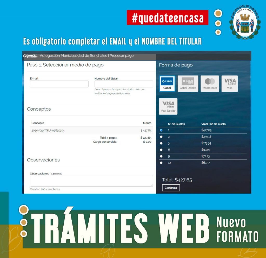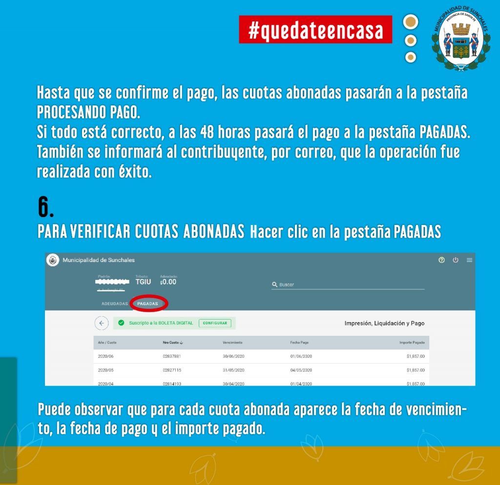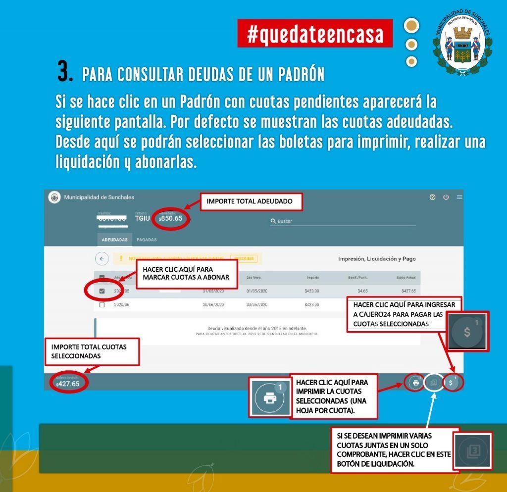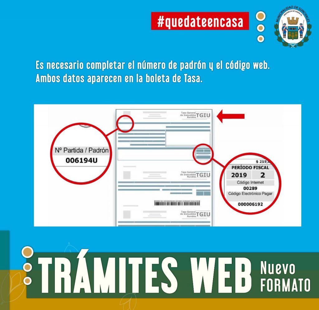 Ingresar a www.sunchales.gob.ar , luego hacer clic en TRAMITES ONLINE, completar con el número de padrón y el código web, ambos datos aparecen en la boleta de Tasa General de Inmuebles.