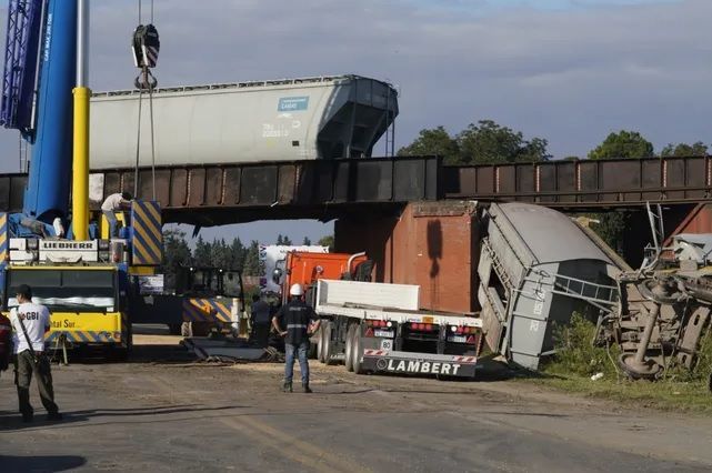 Equipos de operarios y máquinas de "Trenes Argentinos" trabajan en la remoción de dos vagones caídos y de otros tres que descarrilaron sobre un puente en el acceso oeste a Rosario.