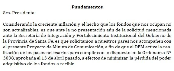 El Concejo insta a hacer entrega de la presentación referida frente a la Secretaría de Integración y Fortalecimiento Institucional del Gobierno de la Provincia de Santa Fe, sin más demoras.