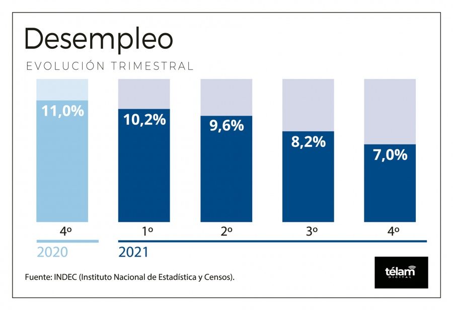 Esta baja en la tasa de desocupación se produjo en un contexto en el que el Producto Bruto Interno (PBI) cerró el 2021 con un crecimiento de 10 por ciento.