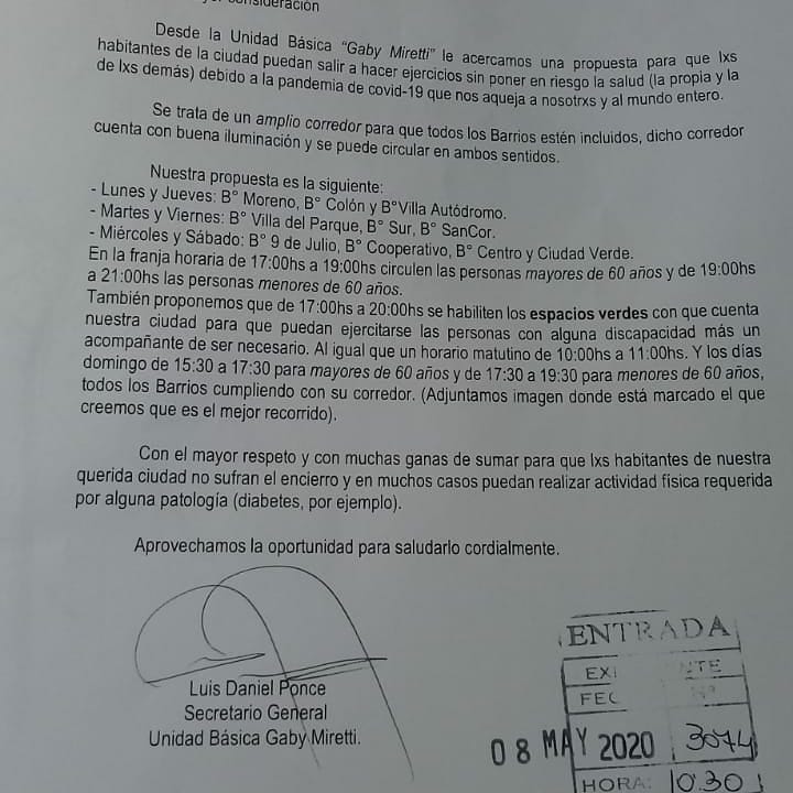 Los integrantes de la Unidad Básica "Gaby" MIretti enviaron un proyecto a l Intendente Gonzalo Toselli proponiendo un "Corredor de Esparcimiento" con detalle de días y barrios.