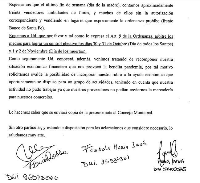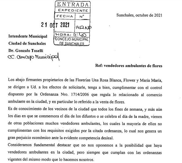 Locales Las florerías locales le solicitaron al Intendente que controle el comercio ambulante ·28 octubre, 2021 ·Lisandro D'Angelis Reenviar Twittear Compartir Fue mediante una carta enviada al Dr. Toselli que lleva la rúbrica de tres propietarias. Además, remitieron una copia al Concejo Municipal. 👇 Aquí la nota. Noticias relacionadas Recuperación y arreglo de calles y caminos en toda la ciudad 16 abril, 2026 Operativos de atención de ANSES en todo el país: cómo será en Sunchales 14 abril, 2026 Nueva edición de Bioferia y Compostaje 14 abril, 2026 Enrico: “El Gobierno de Pullaro está construyendo en Sunchales un nuevo hospital cuatro veces más grande que el actual” 13 abril, 2026 El "Hospital Almícar Gorosito" incorpora un nuevo respirador portátil 10 abril, 2026 Taller "Mi futuro laboral" 9 abril, 2026 Navegación de entradas Siguiente noticiaAnterior noticia