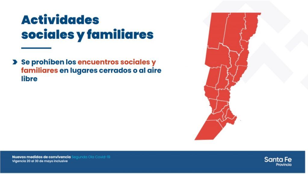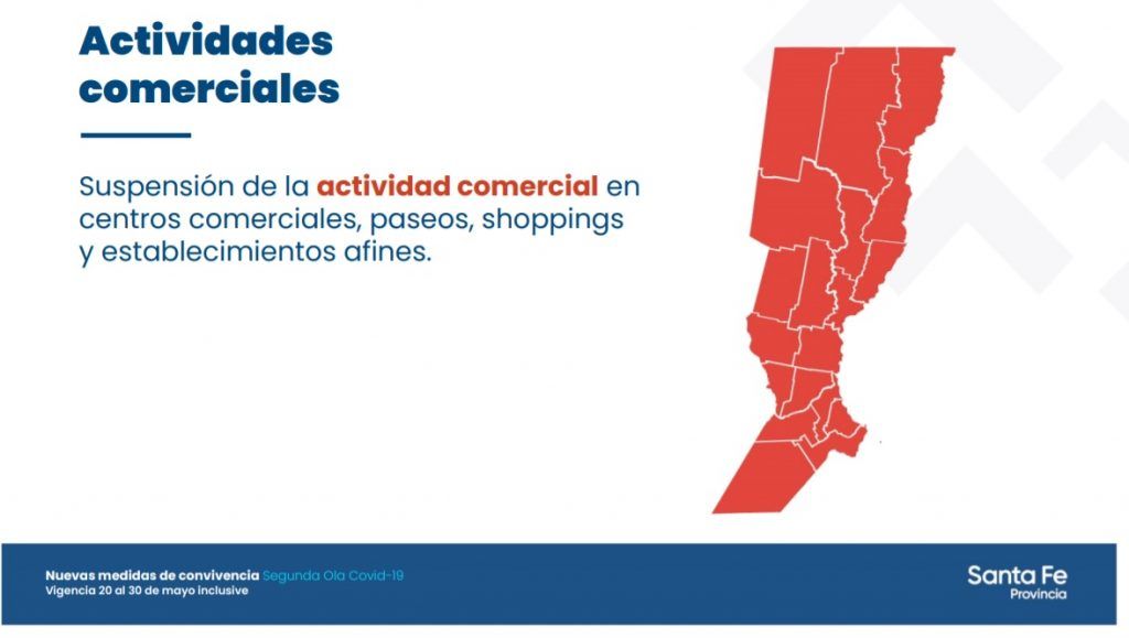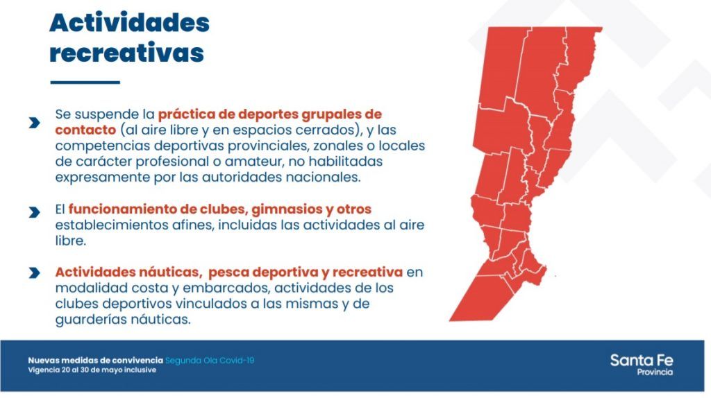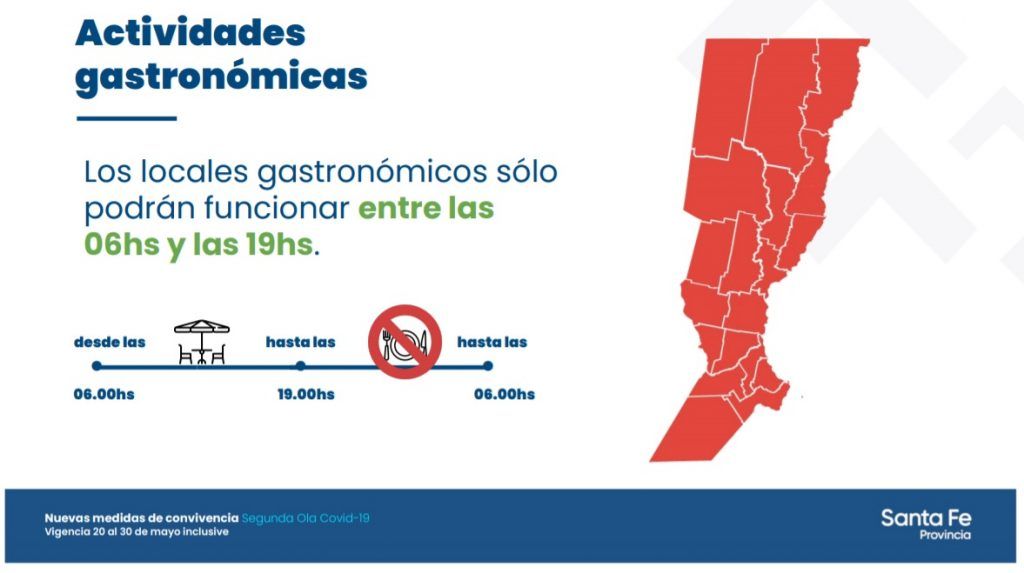 Provinciales Las nuevas medidas en Santa Fe: entre el 20 y el 30 de mayo los locales gastronómicos trabajarán entre las 06:00 y las 19:00 horas y además quedarán suspendidas todas las actividades deportivas, tanto en clubes como en gimnasios ·18 mayo, 2021 ·Grupo Meridiano Reenviar Twittear Compartir Noticias relacionadas Cada amenaza se paga: Santa Fe comienza a cobrar los operativos en escuelas 28 abril, 2026 Inicia la etapa final del nuevo edificio donde funcionará la escuela técnica de Humberto Primo 27 abril, 2026 Pullaro anunció obras para poner en valor el Acceso Oeste y los parques Garay y del Sur 23 abril, 2026 Santa Fe regresa a la Feria del Libro de Buenos Aires con más de mil títulos 22 abril, 2026 Santa Fe: más de 1,2 millones de toneladas y 860 operaciones en el primer trimestre de 2026 20 abril, 2026 Nuevo modelo vial: provincias podrán administrar rutas nacionales 17 abril, 2026 Navegación de entradas Siguiente noticiaAnterior noticia