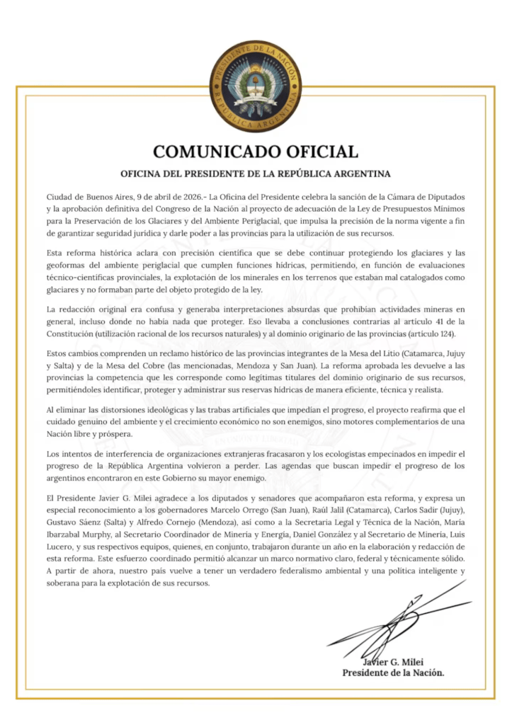 Fue a través de un comunicado de la Oficina del Presidente, donde se destacó que la iniciativa busca “dar precisión” a la normativa vigente para garantizar seguridad jurídica y fortalecer el rol de las provincias en la administración de sus recursos naturales.
