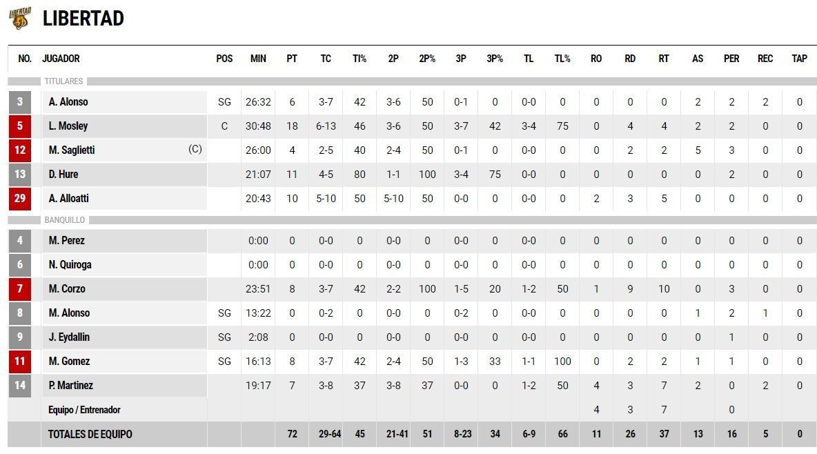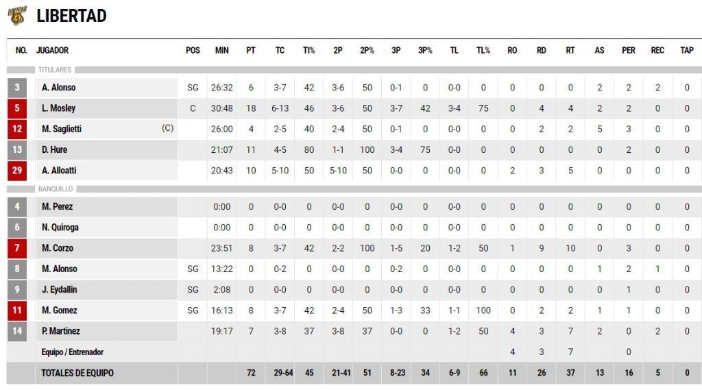 El yankee contó con los buenos aportes de Mariano Fierro (12 + 12 rebotes) y Robert Battle (12 + 7) en la pintura. En los sunchalenses se volvió a destacar Latraius Mosley con 18 unidades.