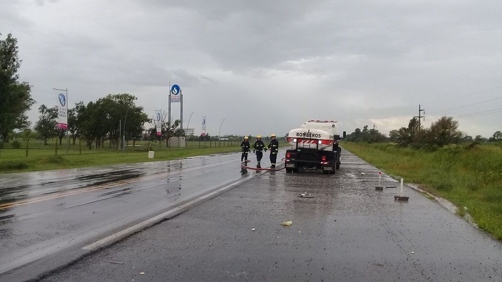 En la mañana de hoy, cuando el sol lo permitió y las precipitaciones cesaron, Bomberos Voluntarios, custodiados por la Gendarmería Nacional trabajaban sobre la cinta asfáltica limpiando con escobillones y mangueras a presión para despejar el cereal derramado.