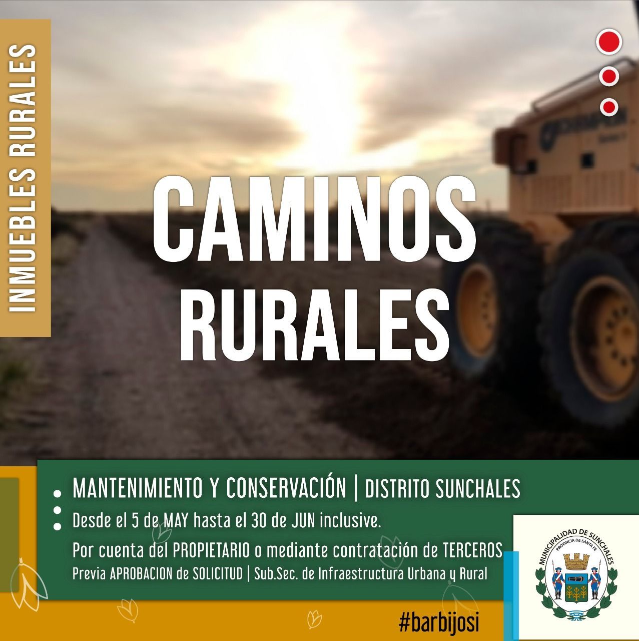 La Municipalidad de Sunchales comunica a los propietarios de inmuebles rurales del distrito Sunchales, conjuntamente con la Sociedad Rural de Sunchales, que a partir del día de la fecha y hasta el 30 de junio (inclusive) del 2020 podrán realizar tareas de conservación y mantenimiento de caminos rurales por cuenta propia o mediante terceros.