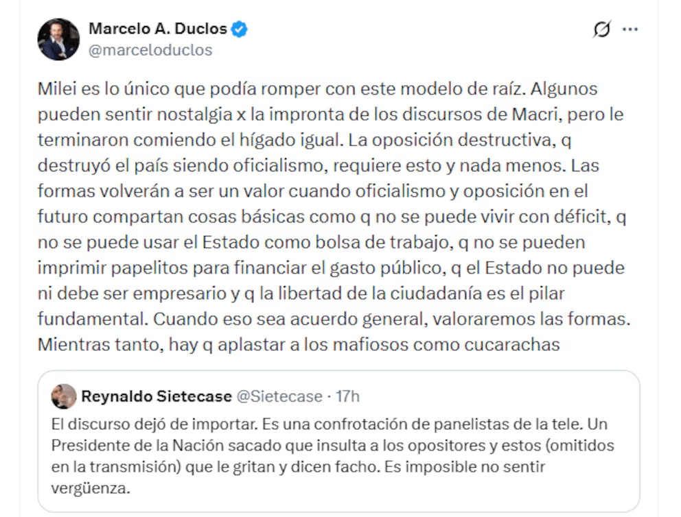 El análisis de Sietecase captó la atención de diferentes figuras y usuarios, abriendo el espacio para otras interpretaciones sobre las formas y el fondo del acto político. En ese hilo, Marcelo Duclos reaccionó con una argumentación que justificó el estilo confrontativo del jefe de Estado. Duclos sostuvo que Milei representa la única alternativa capaz de romper con el modelo político vigente desde hace años. Según su perspectiva, la oposición que en el pasado fue oficialismo y que, en su visión, “destruyó el país”, requiere un trato duro y directo.
