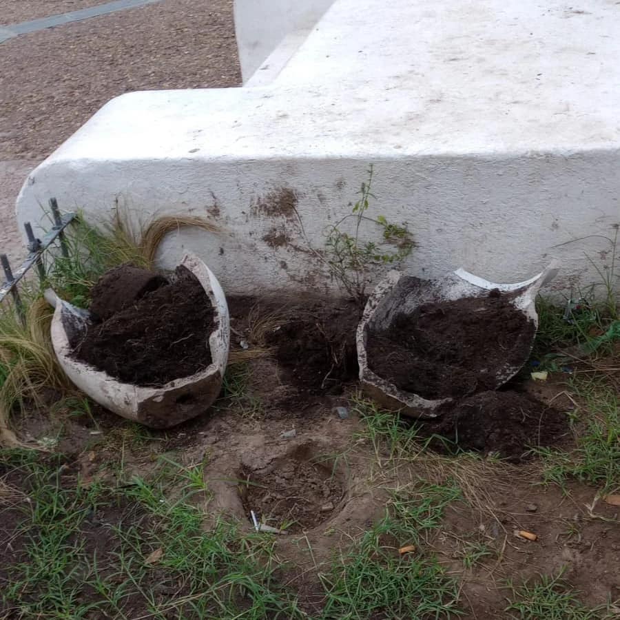 Rompen. Pintan. Dañan lo que incluso les pertenece a ellos, y a todos nosotros. El Municipio había enviado a pintar el MASTIL y a colocar NUEVAS MACETAS hace exactamente un mes.