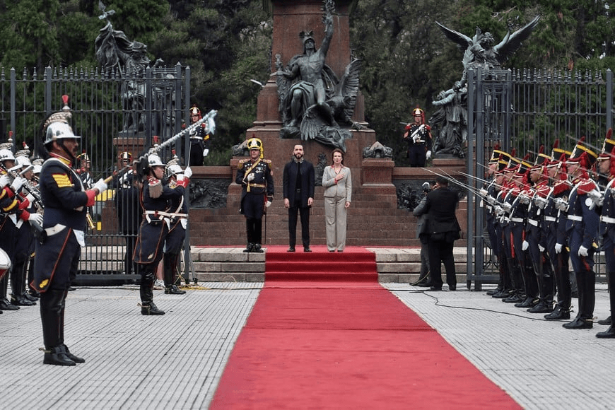 Previo a su llegada a la Rosada, el mandatario salvadoreño había hecho la habitual ofrenda floral en Plaza San Martín, en Retiro, donde estuvo acompañado por la canciller Diana Mondino, y desde allí se trasladó a la sede gubernamental.