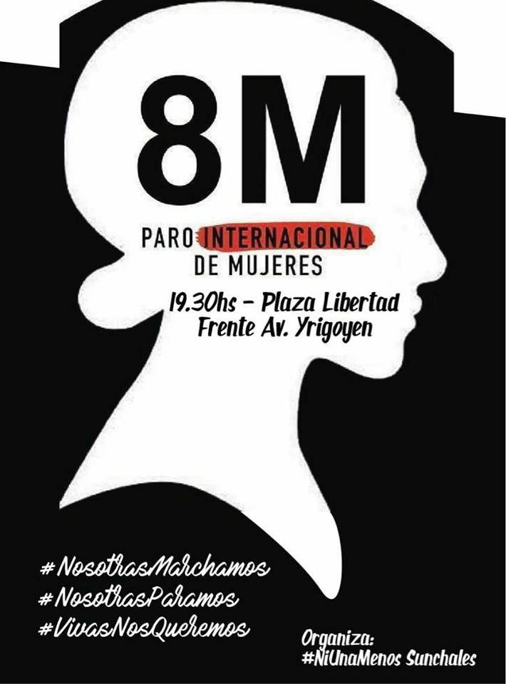La mesa de NIUNAMENOS Sunchales, comunica que el día 8 de marzo se realizará un acto y movilización en el marco del Paro Internacional de Mujeres previsto para la fecha. Ese día se conmemora el Día Internacional de la Mujer Trabajadora y se recuerda a todas las que lucharon y/o murieron en defensa y reclamo de los derechos que las mujeres debimos conquistar.