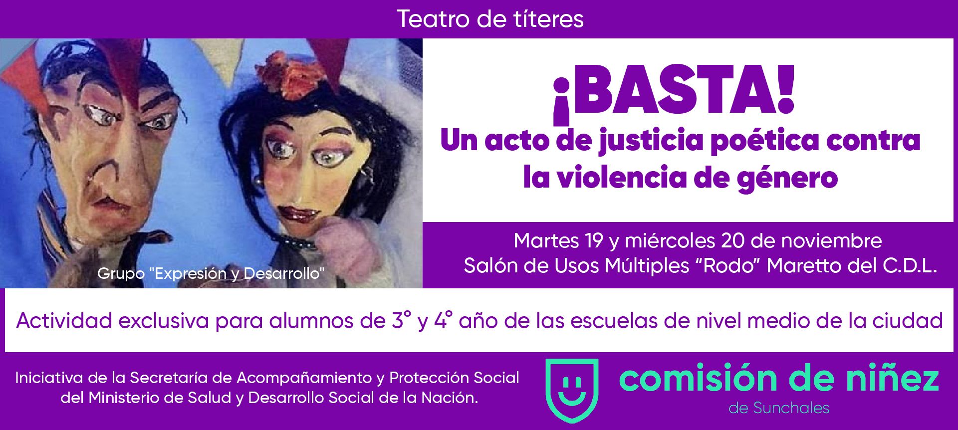 La Comisión para la Promoción y Protección de Derechos de Niños, Niñas y Adolescentes organiza la presentación del teatro de títeres "¡BASTA! Un acto de justicia poética contra la violencia de género", una iniciativa de la Secretaría de Acompañamiento y Protección Social del Ministerio de Salud y Desarrollo Social de la Nación y con la labor artística del Grupo “Expresión y Desarrollo”.
