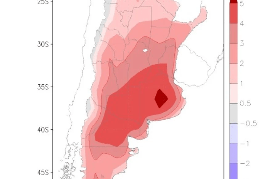 La franja central será, sin duda, la región que más se verá afectada por este fenómeno. Provincias como Buenos Aires, La Pampa, Córdoba, y parte de Santa Fe mostrarán un marcado incremento en la temperatura media. En estas zonas, las temperaturas se mantendrán considerablemente por encima del promedio estacional, con un aumento que podría tener implicancias tanto en la agricultura como en el confort térmico de la población.
