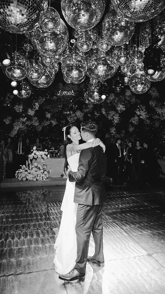 Por su parte, el futbolista cordobés recordó la fecha con una foto en blanco y negro de ambos en medio de la pista del salón. En la imagen, que figura a continuación, se ve a la pareja bailando bajo una gran cantidad de “bolas de disco” que cuelgan del techo y en presencia de los invitados, quienes parecen haber decidido apartarse del lugar para darle un poco de privacidad en lo que pareció ser uno de sus primeros bailes como marido y mujer, el cual realizaron ataviados con los mismos atuendos con los que pasaron por el altar.