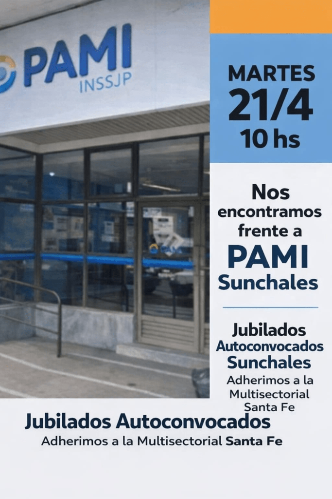 En paralelo, jubilados autoconvocados de Sunchales anunciaron una convocatoria para visibilizar la situación. La concentración será este martes 21 de abril a las 10:00 frente a la sede local del PAMI, en adhesión a la Multisectorial Santa Fe.