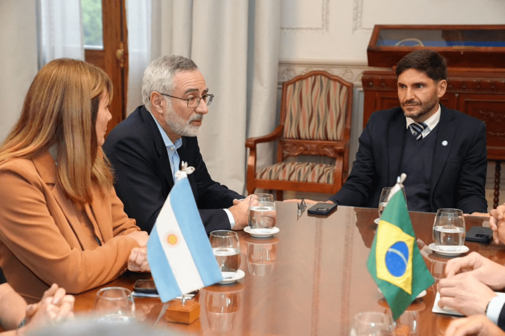 El gobernador Maximiliano Pullaro recibió este martes al embajador de Brasil en Argentina, Julio Glinternick Bitelli, en la sede de Gobierno en la ciudad de Rosario, para abordar la vinculación productiva, ambiental y cultural de la provincia de Santa Fe con el país latinoamericano.