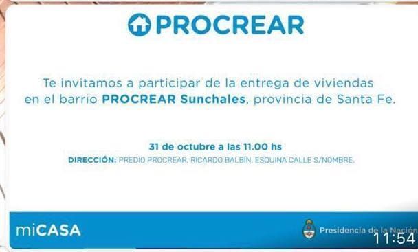 La semana pasada se supo que el próximo 31 de octubre se hará entrega de viviendas en el “barrio PROCREAR Sunchales” tal como lo anuncia la invitación difundida vía whatsapp y que está firmada por Presidencia de la Nación y el programa “miCASA”.