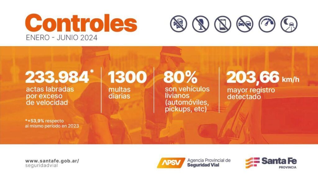 En los primeros seis meses del año se labraron 233.984 actas por exceso de velocidad, lo que implica un crecimiento del 53 % respecto al mismo período en 2023. En 2024, el mayor registro detectado es el de un conductor que circulaba a 203,66 km/h, donde la máxima permitida era de 60. Otros valores altos encontrados también son frecuentes en las rutas de la provincia tales como 197, 181 y 174 km/h.