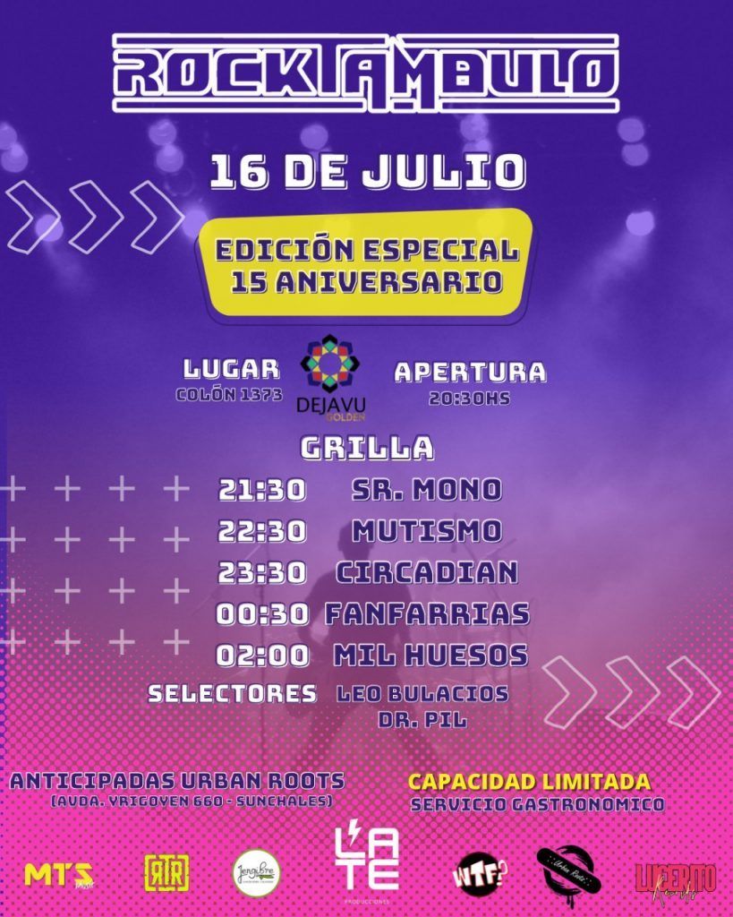 El evento cuenta con servicio de cantina. Las anticipadas están a la venta en Urban Roots Skate Shop (Avda Yrigoyen 660 – Sunchales). El Rocktambulo es un evento cultural producido por “Late Música Producciones”, cuyo objetivo es dar difusión y puesta en escena al trabajo de artistas locales y la región; y además busca generar un punto de encuentro entre artistas, músicos, aficionados, ciudadanos y ciudadanas en general, para disfrutar de música en vivo.