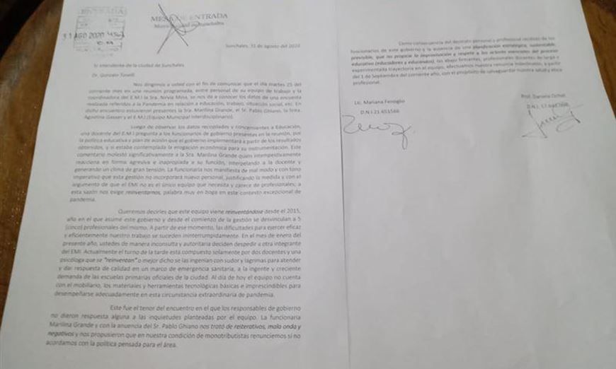Con una nota fechada en el último día del mes de agosto de este año las docentes: Lic. Mariana Fenoglio y Prof. Daniela Ochat hicieron conocer el intendente Gonzalo Toselli los motivos de su renuncia al puesto que ocupaban dentro del Equipo Municipal Interdisciplinario.