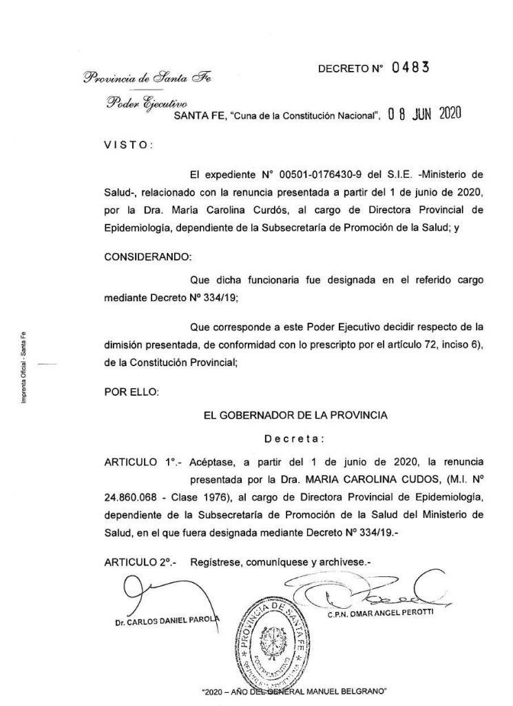 En tanto, Carolina Cudós, directora provincial de Epidemiología dependiente del Ministerio de Salud de la Provincia, presentó su renuncia al cargo a partir del 1 de junio pasado. Hasta el momento no se informaron los motivos de la dimisión, que ya fue aceptada por el gobernador. Según trascendió, Cudós tomaría otro cargo dentro de la estructura ministerial.