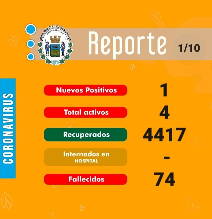 CoronavirusLocales Reporte Epidemiológico: 1 nuevo contagio de Coronavirus en la ciudad ·2 octubre, 2021 ·Lisandro D'Angelis Reenviar Twittear Compartir Así lo comunicó anoche el Departamento de Prensa del Municipio local. Los activos son 4 y actualmente no hay personas internadas en el Hospital "Almícar Gorosito". Noticias relacionadas Yas Nizetich visitó Sunchales junto a Prevención Salud y compartió una jornada de formación y encuentro con la comunidad deportiva 28 abril, 2026 Juan Carlos Pallarols visitará Sunchales con el cáliz del Papa León XIV y encabezará un cincelado abierto a la comunidad 28 abril, 2026 La Municipalidad de Sunchales lanzó su propio asistente digital 24 abril, 2026 Reparación de bacheos en nuestra ciudad 23 abril, 2026 Renovación parcial de autoridades en el CCIP y su Mutual para el ejercicio 2026 22 abril, 2026 Acto por el Día del Idioma 21 abril, 2026 Navegación de entradas Siguiente noticiaAnterior noticia
