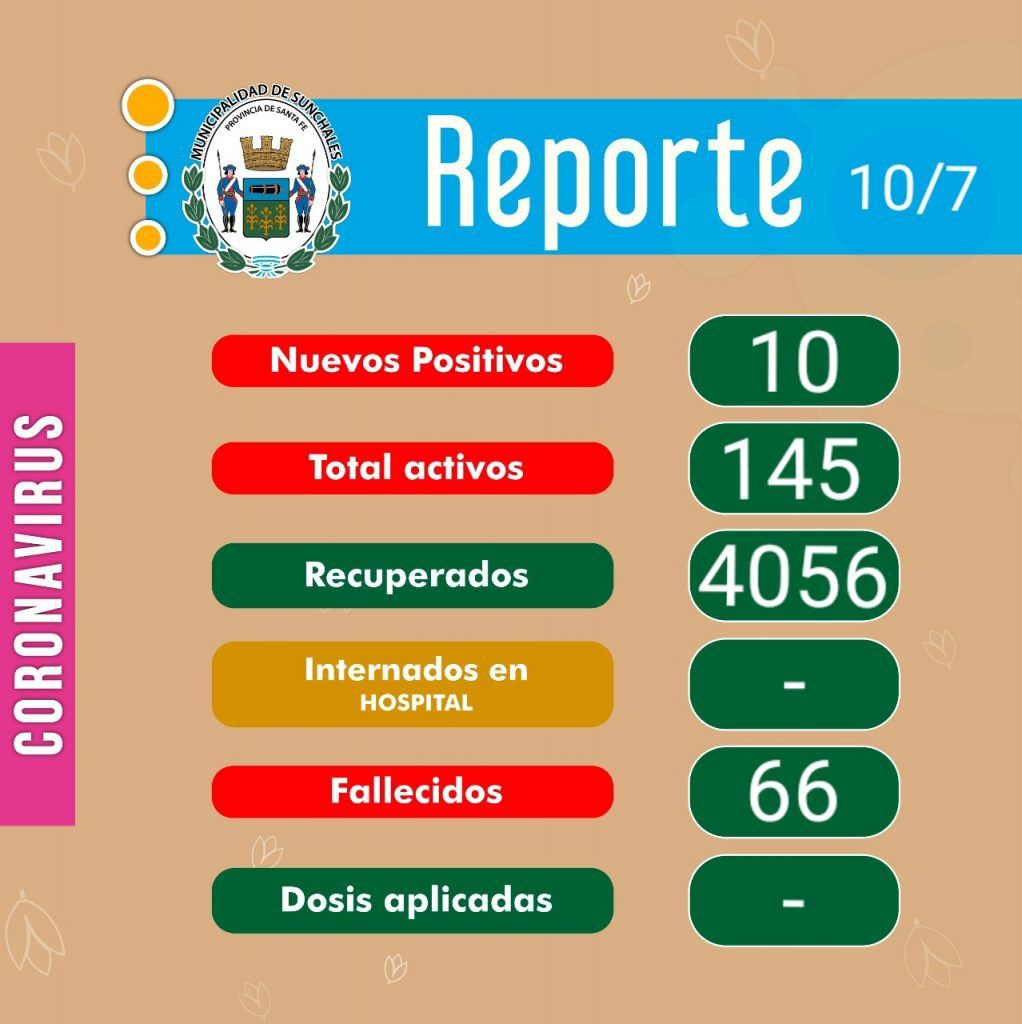 CoronavirusLocales Reporte Epidemiológico: 10 nuevos contagios de Coronavirus en la ciudad ·11 julio, 2021 ·Grupo Meridiano Reenviar Twittear Compartir Así lo informó anoche el Departamento de Prensa del Municipio. Los casos activos en Sunchales son 145, mientras que las personas recuperadas ya son más de 4000. Noticias relacionadas Recuperación y arreglo de calles y caminos en toda la ciudad 16 abril, 2026 Operativos de atención de ANSES en todo el país: cómo será en Sunchales 14 abril, 2026 Nueva edición de Bioferia y Compostaje 14 abril, 2026 Enrico: “El Gobierno de Pullaro está construyendo en Sunchales un nuevo hospital cuatro veces más grande que el actual” 13 abril, 2026 El "Hospital Almícar Gorosito" incorpora un nuevo respirador portátil 10 abril, 2026 Taller "Mi futuro laboral" 9 abril, 2026 Navegación de entradas Siguiente noticiaAnterior noticia