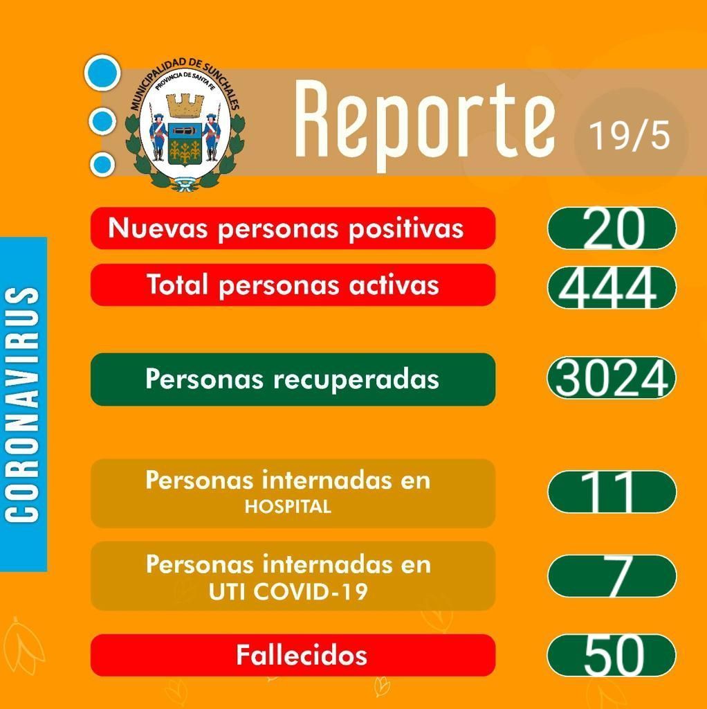 El Municipio informa a la comunidad sobre la situación epidemiológica de Sunchales. Los activos son 444. Hay 11 personas internadas en el Hospital "Almícar Gorosito" y 7 en la UTI.
