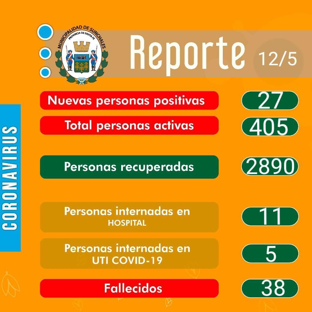 CoronavirusLocales Reporte Epidemiológico: 27 nuevos casos en Sunchales ·13 mayo, 2021 ·Lisandro D'Angelis Reenviar Twittear Compartir El Municipio informa a toda la comunidad sobre la situación epidemiológica de nuestra ciudad. Son 407 los activos, con 11 internados en el Hospital y 5 en la UTI. Noticias relacionadas Sunchales reconoce a cooperativas y mutuales escolares 6 octubre, 2025 Pablo Farías: “Desde Provincias Unidas queremos llevar al Congreso el estilo de gestión que tenemos en Santa Fe” 6 octubre, 2025 Corte de energía programado para este domingo 5 3 octubre, 2025 El intendente Pinotti mantuvo una reunión con el gobernador Pullaro 1 octubre, 2025 Pinotti presentó la revitalización del Predio Ferroviario que demandará una inversión de 820 millones de pesos 30 septiembre, 2025 Pinotti impulsa obras hídricas, pavimento y equipamiento municipal en su encuentro con el gobernador 30 septiembre, 2025 Navegación de entradas Siguiente noticiaAnterior noticia