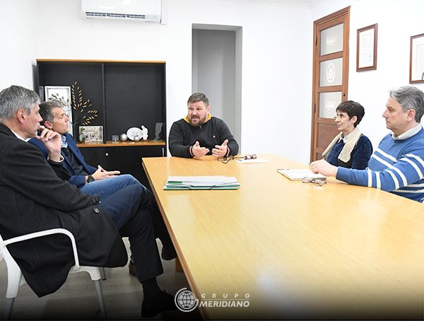 El Intendente de Sunchales, Pablo Pinotti, junto a la Secretaria de Gobierno, Andrea Ochat, y el Secretario de Producción y Finanzas, Fernando Chamorro, se reunieron con Fernando Sterren, Gerente Regional de Empresas, y Juan Reinaldo Muller, Oficial de Municipios y Comunas del Banco Santa Fe.
