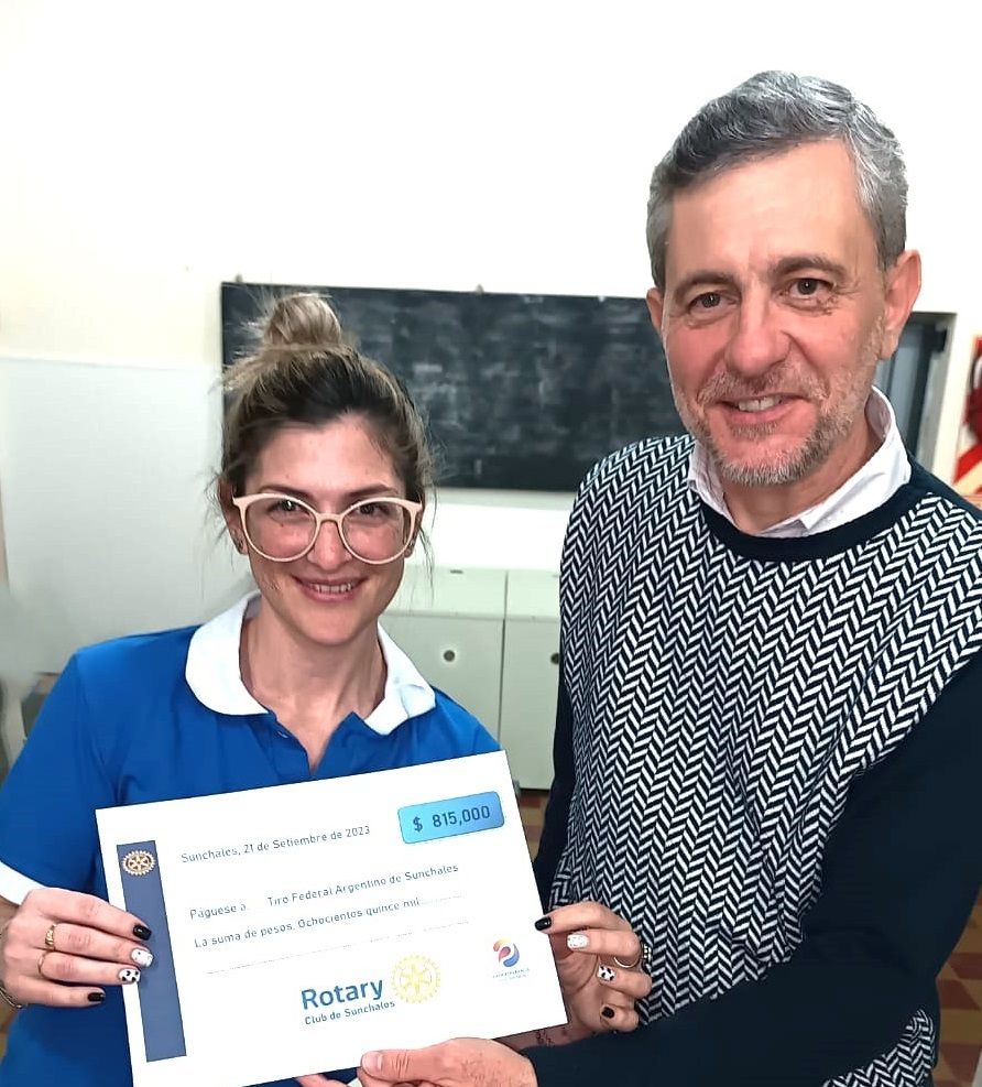 Ariel Gagliardo (Presidente del Rotary Club Sunchales) le hizo entrega a Luisina Muñoz (Presidente del Club Tiro Federal Argentino) un cheque simbólico.