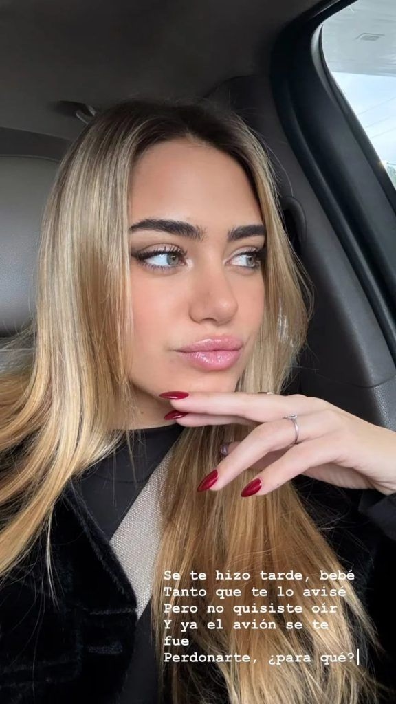 Mientras tanto, la cuenta oficial de Instagram de Alan Simone estuvo inactiva hasta el domingo, lo que avivó aún más los rumores de crisis entre la pareja. En ese tiempo, Sabrina no compartió contenido junto al joven de Chivilcoy, pero sí lanzó una explosiva indirecta. La modelo publicó una historia con la canción “Perdonarte, ¿para qué?”, de Emilia Mernes y Los Ángeles Azules, cuyas letras reflejan un mensaje de decepción y ruptura: “Se te hizo tarde bebé, tanto que te lo avisé. Pero no quisiste oír y ya el avión se te fue. Perdonarte, ¿para qué? Para que vuelvas a fallarme otra vez. No, muchas gracias, ese chiste ya no me hace gracia”.