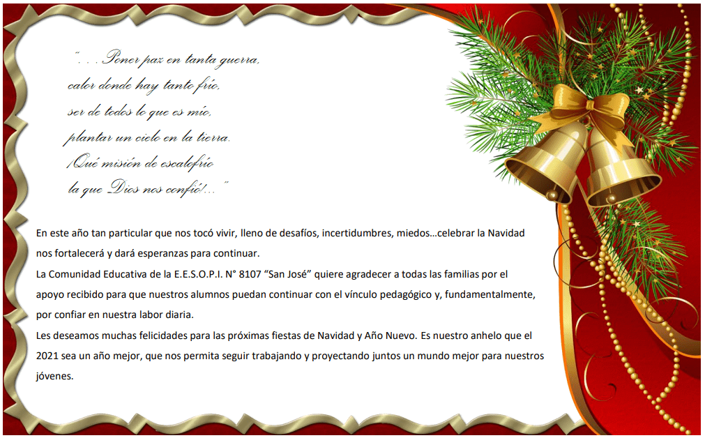 Por ello, renovando el compromiso, la voluntad de trabajo y las esperanzas de un mañana mejor, saludo a todas las familias en estas tradicionales fiestas y agradezco el esfuerzo por sostener los cimientos de las comunidades.