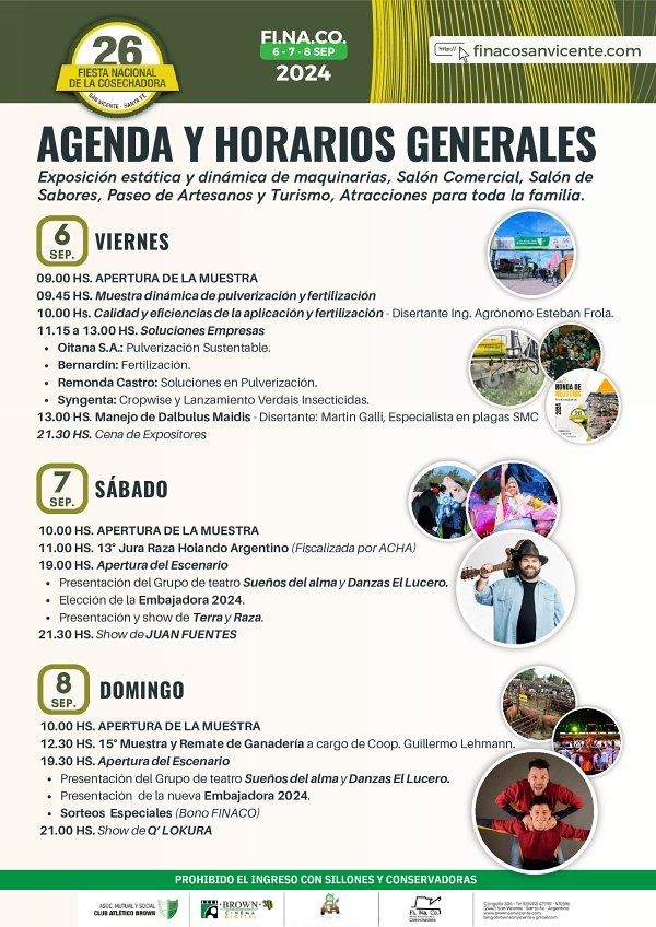 Será la 26ª Fiesta Nacional de la Cosechadora y se extenderá desde este viernes 6 al domingo 8. Exposición estática y dinámica de maquinarias, Salón Comercial, Salón de Sabores, Paseo de Artesanos y Turismo, Atracciones para toda la familia. El sábado se presentará Juan Fuentes y el domingo cerrará Q Locura.