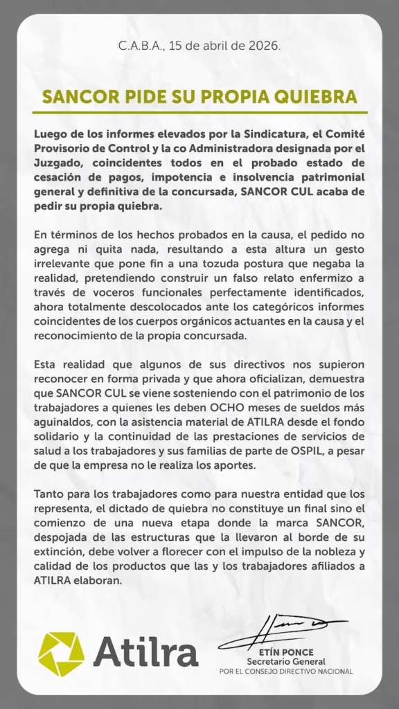 Para el sindicato, si la Justicia dicta la quiebra esto “no constituye un final sino el comienzo de una nueva etapa donde la marca SanCor, despojada de las estructuras que la llevaron al borde de su extinción, debe volver a florecer con el impulso de la nobleza y calidad de los productos que las y los trabajadores afiliados a Atilra elaboran”.