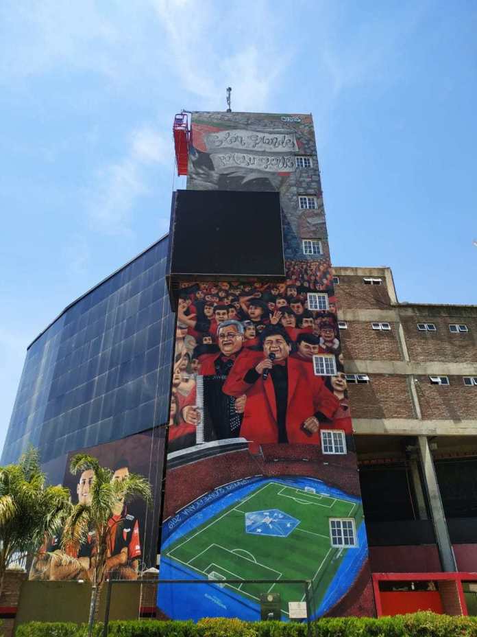 La obra de arte (24 por 10 metros) que empezó a pintarse hace dos semanas, estuvo a cargo del artista santafesino Andrés Iglesias. Se estrenó el lunes 9 en el estadio "Brigadier López".