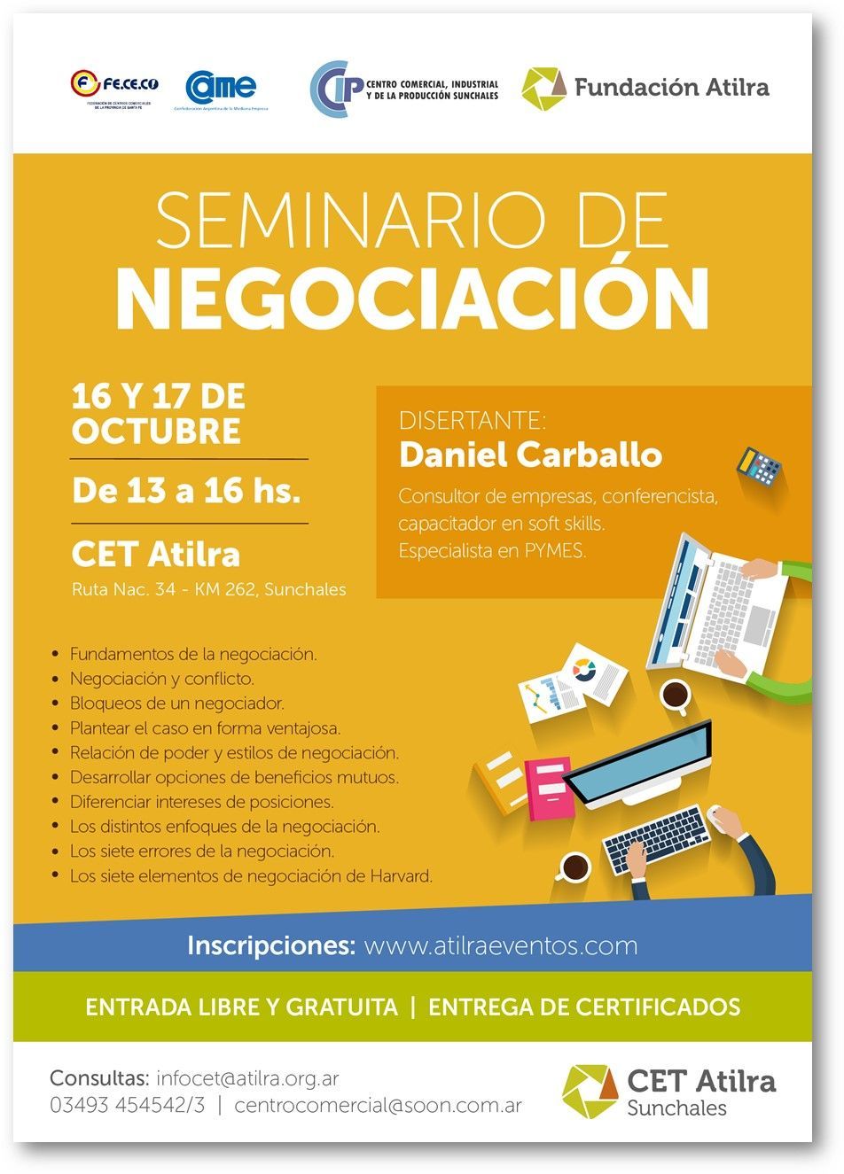 Se dictará los días 16 y 17 de octubre entre las 13:00 y las 16:00 horas, con la presencia de Daniel Carballo, Licenciado en Comercialización, Consultor de empresas y Especialista en PYMES. Cabe destacar que, las inscripciones se pueden realizar en www.atilraeventos.com.