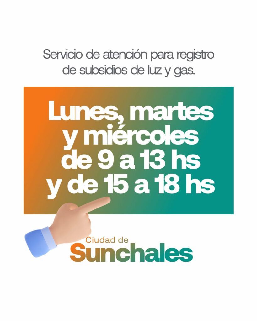 La Municipalidad de Sunchales informa que, debido a la gran concurrencia de personas para realizar el trámite de "Suscripción al subsidio de luz y gas", hemos decidido ampliar los horarios de atención para su mayor comodidad y conveniencia.