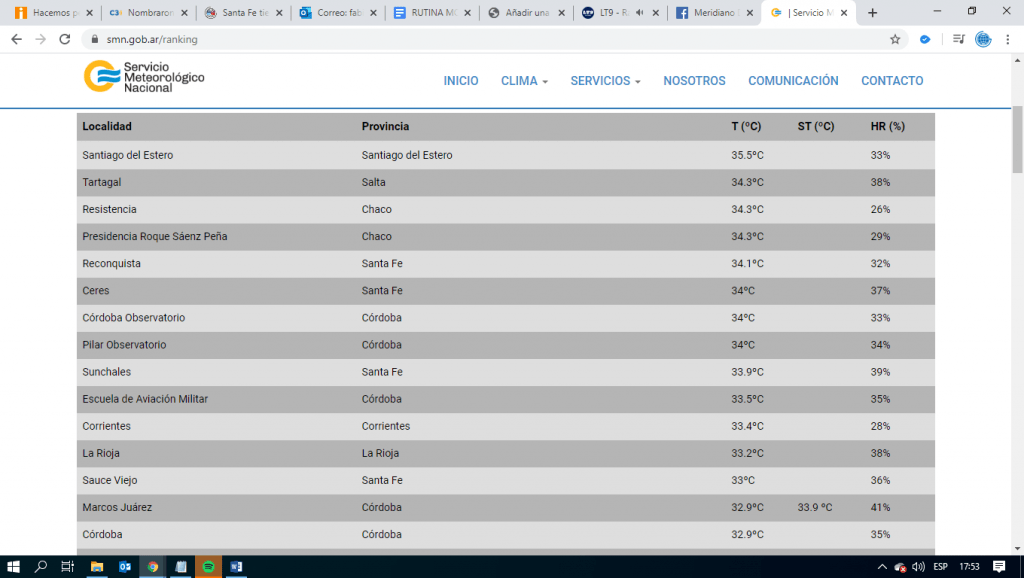 Por otro lado hoy se registraron temperaturas altas en gran parte del país. En el ranking que publica el Servicio Meteorológico Nacional, nuestra ciudad, Sunchales, se ubica en el puesto número 9 con una máxima que alcanzó los 33,9 grados.