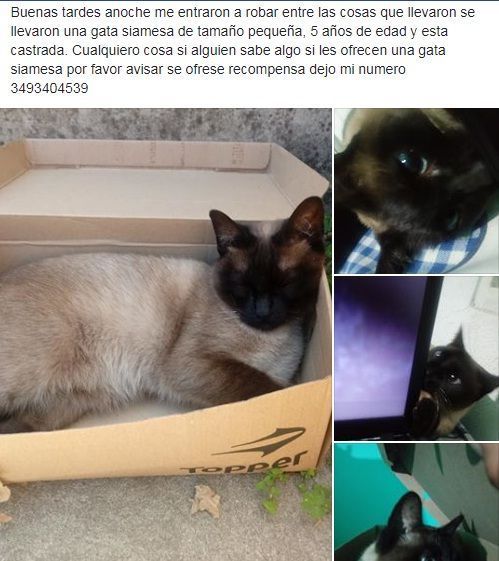 Buenas tardes anoche me entraron a robar entre las cosas que llevaron se llevaron una gata siamesa de tamaño pequeña, 5 años de edad y esta castrada. Cualquier cosa si alguien sabe algo si les ofrecen una gata siamesa por favor avisar se ofrece recompensa dejo mi numero 3493404539