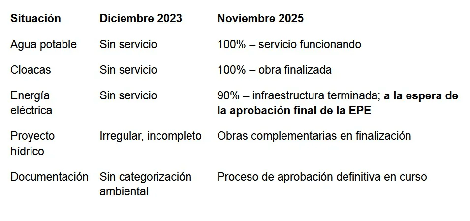 El informe concluye que en dos años, Sunchalote pasó de estar sin servicios, sin orden y sin avances, a contar con agua y cloacas en funcionamiento, energía eléctrica técnicamente terminada y lista para habilitar, y un proyecto que avanza hacia su regularización final.