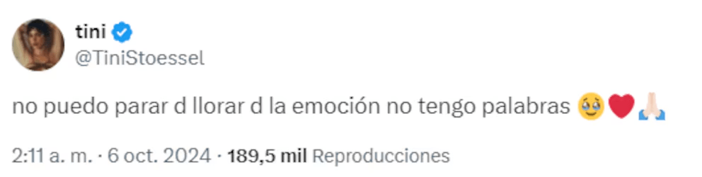 Fiel a su estilo profesional, Tini brindó una presentación impecable. Sin embargo, no pudo contener las lágrimas de emoción al finalizar la interpretación y Chris atinó a darle un abrazo para contenerla. “No puedo parar de llorar de la emoción, no tengo palabras”, publicaría más tarde, a modo de reacción, en su cuenta personal de X.